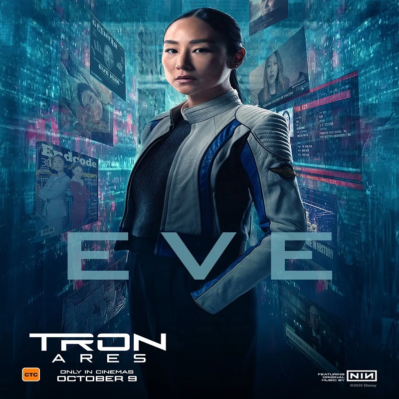 Eve Kim, a outra protagonista do filme, não me convenceu que sua busca pelo código de permanência fosse por um bem maior. Me pareceu uma forçação de barra do roteiro que ela antagonizasse com Julian, o vilão de “Tron: Ares”.