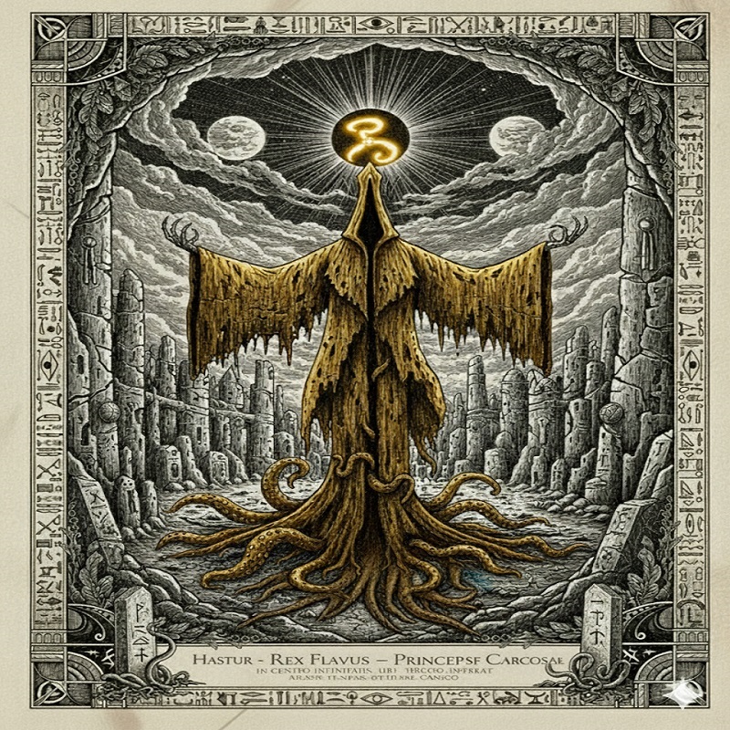 Hastur, o Inonimável, é um Grande Antigo que vive na cidade mítica e decadente de Carcosa, que existe em um plano de realidade diferente, possivelmente no sistema estelar das Híades, perto do Lago Hali. Ela é eternamente envolta em névoa e escuridão, com seus famosos sóis gêmeos pairando no céu.