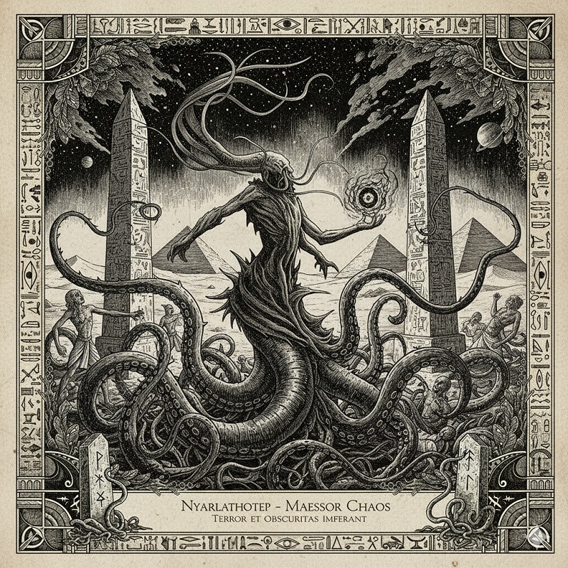 Nyarlathotep age como o mensageiro e executor dos Deuses Exteriores, principalmente de Azathoth, servindo como a “alma” ou “coração” do Deus Idiota Cego. Seu principal passatempo é manipular a humanidade, semear a discórdia, estabelecer cultos para seus mestres e o mais importante, levar as pessoas à loucura de forma sádica e calculada.